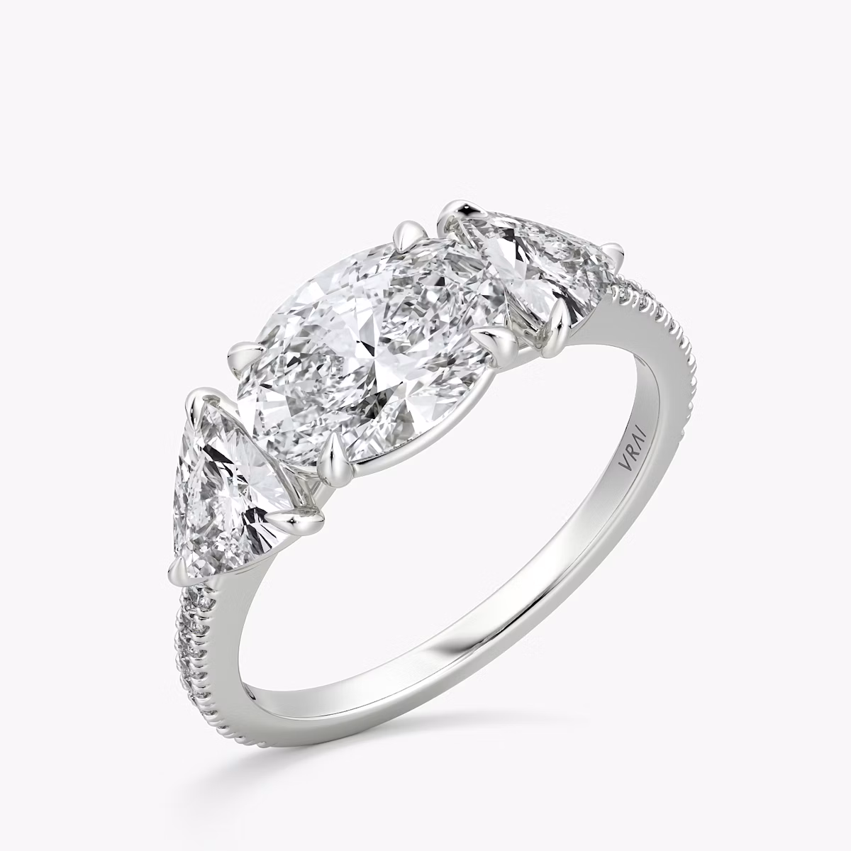 Select a north-south or east-west setting and your center diamond to complete your purchase; VRAI's design team will match your side stones in color grade for the perfect final touch.